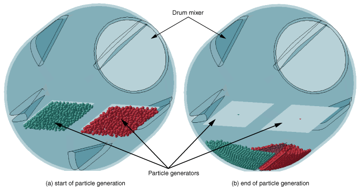 Model creation: In many applications the particle generator can be used to fill part of a domain with particles to establish initial conditions for subsequent studies. Figure 15.3.1–1 shows an example where two particle generators are filling a drum mixer with two different batches of particles prior to performing a mixing simulation. The sequence of images show the start and end of the particle generation phase.