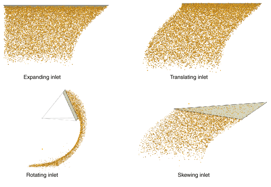 The size and shape of the inlet surface can be modified during an analysis by adjusting the nodal positions of the inlet surface. The inlet surface can expand, collapse, and translate as well as undergo rigid body motions. Figure 15.3.1–4 shows the inlet surface of four different generators being subjected to different deformation and motion.| Input File Usage: | *PARTICLE GENERATOR INLET, SURFACE=inlet_surface_name |