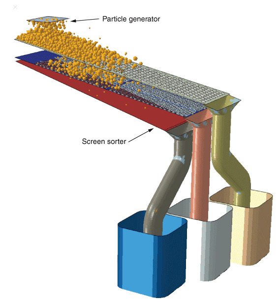 Continuous generation: In another type of application a particle generator can be used to inject a continuous stream of particles into the domain while an event of interest involving particles that have been introduced is underway. Figure 15.3.1–2 shows the use of a particle generator in a sorting analysis. In this application a particle generator is continuously feeding random sized particles to a screen sorter assembly while the analysis is in progress.