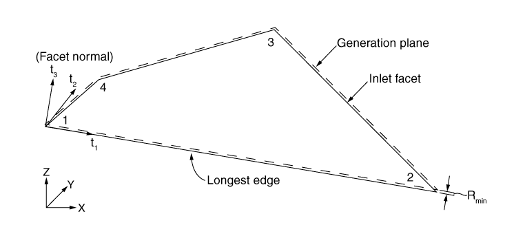 The current coordinates of the nodes of each facet in the inlet surface are used to define a plane (a generation plane) where particles will be generated. Figure 15.3.1–6 shows the local directions of the generation plane. The first local direction,