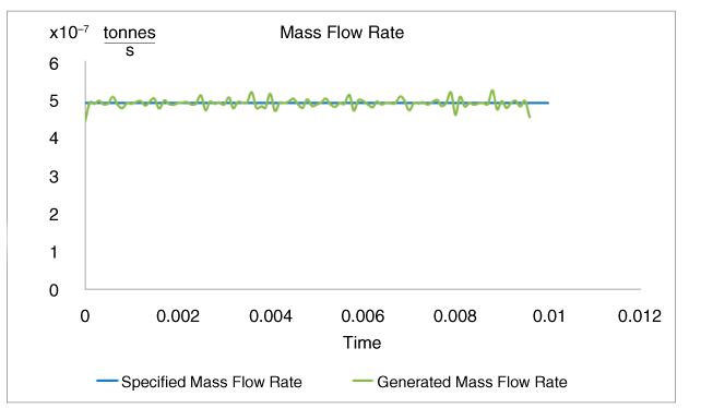 The rate of generation of particles is governed by the specified mass flow rate per unit area at the inlet, the area of the inlet, and the ability of the generator to insert a particle of a given size. The time varying mass flow rate per unit inlet area,