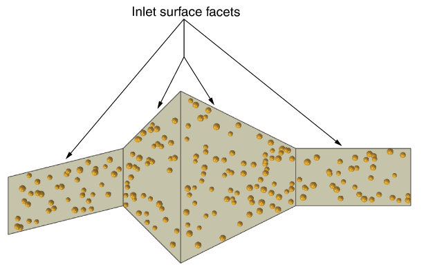 For a given particle generator, particles of all species are introduced into the domain through the inlet with a specified flow speed. The flow direction of the particles is along the normal to the inlet facet. Particles generated from different facets in the inlet surface will all have the same flow speed; however, depending on the facet normal direction, they may have different velocities. The time varying particle flow speed must be provided in the form of an amplitude table (“Amplitude curves,” Section 34.1.2).
