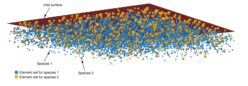 In many applications several different types of particles interact with each other. For example, sand, cement, and aggregate particles are mixed together to prepare a batch of concrete. A particle generator can be used to generate one or more species of particles as shown in Figure 15.3.1–5, where the two colors represent the two species of particles that have been simultaneously generated by a particle generator. An element set name is associated with each species in the mixture. This is analogous to a regular DEM analysis where the particles are grouped into element sets.