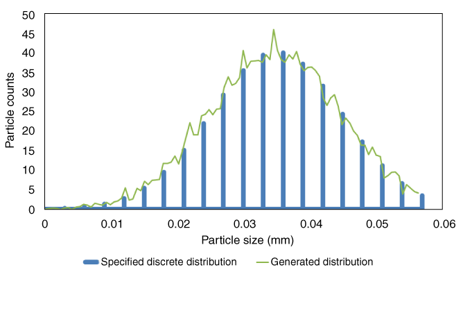 Abaqus/Explicit discards particle sizes that are outside the specified minimum and maximum range for the PDF. For normal and log-normal type PDFs this leads to a truncated distribution, as explained in “Probability density function,” Section 2.12.1. Keep this in mind when comparing the generated particle size distribution to the target PDF.