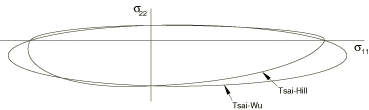 Figure 22.2.3–2 Tsai-Hill versus Tsai-Wu failure envelope (, ).