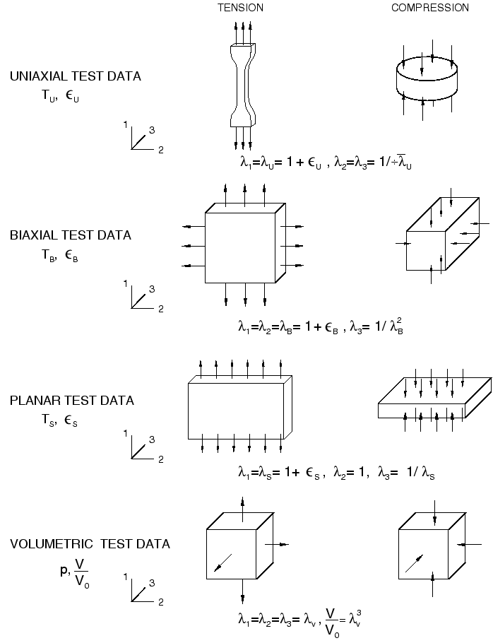 affect the uniaxial, equibiaxial, and planar stress results. However, since the material is assumed to be only slightly compressible, the techniques described for obtaining the deviatoric coefficients should give sufficiently accurate values even though they assume that the material is fully incompressible.