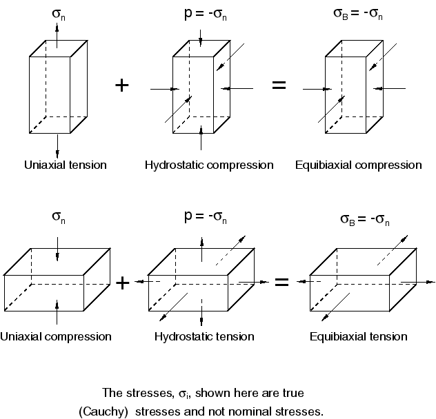 The superposition of a tensile or compressive hydrostatic stress on a loaded, fully incompressible elastic body results in different stresses but does not change the deformation. Thus, Figure 22.5.1–3 shows that some apparently different loading conditions are actually equivalent in their deformations and, therefore, are equivalent tests: