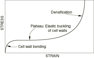 The next stage is a plateau of deformation at almost constant stress, caused by the elastic buckling of the columns or plates that make up the cell edges or walls. In closed cells the enclosed gas pressure and membrane stretching increase the level and slope of the plateau.