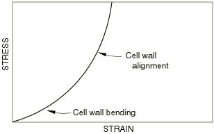 At small strains the foam deforms in a linear, elastic manner as a result of cell wall bending, similar to that in compression.