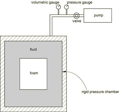 A volumetric compression test is illustrated in Figure 22.5.2–4. The pressure exerted on the foam specimen is the hydrostatic pressure of the fluid, and the decrease in the specimen volume is equal to the additional fluid entering the pressure chamber. The specimen is sealed against fluid penetration.