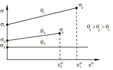 Alternatively, the static part of the hardening can be defined at zero strain rate, and the rate-dependent part can be defined utilizing the overstress power law (see Rate-dependent yield, Section 23.2.3). In that case, zero static hardening at or above the annealing temperature can be specified by specifying a single data point (at zero plastic strain) in the yield stress versus plastic strain curve at or above the annealing temperature. The overstress power law parameters can also be appropriately selected to ensure that at or above the annealing temperature the yield stress does not vary with strain rate. This can be accomplished by selecting a large value for the parameter (relative to the static yield stress) and setting the parameter .