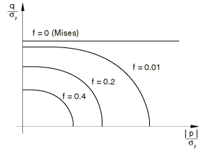 The model is illustrated in Figure 23.2.9–1, where the yield surfaces for different levels of void volume fraction are shown in the p–q plane.