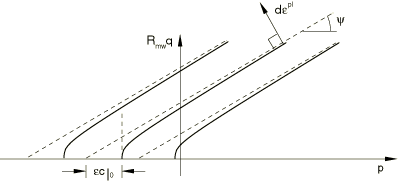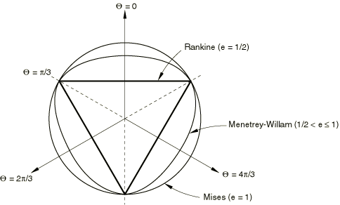 This flow potential, which is continuous and smooth, ensures that the flow direction is always uniquely defined. A family of hyperbolic potentials in the meridional stress plane is shown in Figure 23.3.3–3, and the flow potential in the deviatoric stress plane is shown in Figure 23.3.3–4.