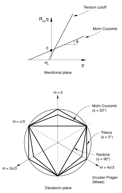 The yield surface is a composite of two different criteria: a shear criterion, known as the Mohr-Coulomb surface, and an optional tension cutoff criterion, modeled using the Rankine surface.