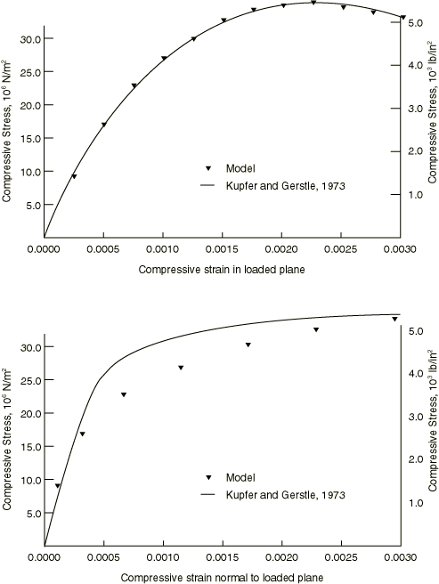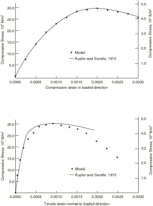 With proper calibration, the concrete model should produce reasonable results for mostly monotonic loadings. Comparison of the predictions of the model with the experimental results of Kupfer and Gerstle (1973) are shown in Figure 23.6.1–6 and Figure 23.6.1–7.
