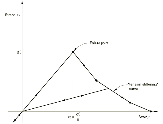 The postfailure behavior for direct straining across cracks is modeled with tension stiffening, which allows you to define the strain-softening behavior for cracked concrete. This behavior also allows for the effects of the reinforcement interaction with concrete to be simulated in a simple manner. Tension stiffening is required in the concrete smeared cracking model. You can specify tension stiffening by means of a postfailure stress-strain relation or by applying a fracture energy cracking criterion.