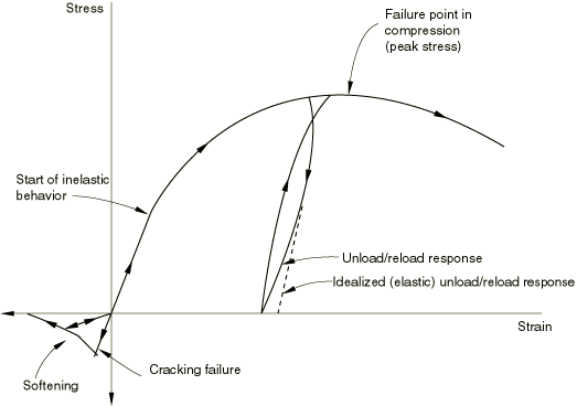 When concrete is loaded in compression, it initially exhibits elastic response. As the stress is increased, some nonrecoverable (inelastic) straining occurs and the response of the material softens. An ultimate stress is reached, after which the material loses strength until it can no longer carry any stress. If the load is removed at some point after inelastic straining has occurred, the unloading response is softer than the initial elastic response: the elasticity has been damaged. This effect is ignored in the model, since we assume that the applications involve primarily monotonic straining, with only occasional, minor unloadings. When a uniaxial concrete specimen is loaded in tension, it responds elastically until, at a stress that is typically 7%–10% of the ultimate compressive stress, cracks form. Cracks form so quickly that, even in the stiffest testing machines available, it is very difficult to observe the actual behavior. The model assumes that cracking causes damage, in the sense that open cracks can be represented by a loss of elastic stiffness. It is also assumed that there is no permanent strain associated with cracking. This will allow cracks to close completely if the stress across them becomes compressive.