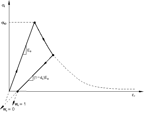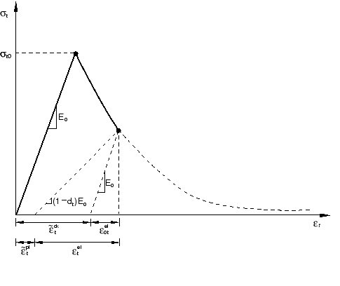 In reinforced concrete the specification of postfailure behavior generally means giving the postfailure stress as a function of cracking strain, . The cracking strain is defined as the total strain minus the elastic strain corresponding to the undamaged material; that is, , where , as illustrated in Figure 23.6.3–3. To avoid potential numerical problems, Abaqus enforces a lower limit on the postfailure stress equal to one-hundreth of the initial failure stress: .
