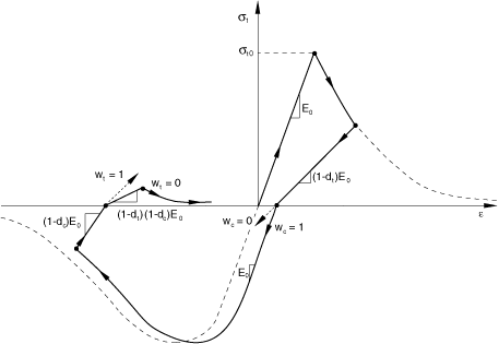 The weight factors and , which are assumed to be material properties, control the recovery of the tensile and compressive stiffness upon load reversal. To illustrate this, consider the example in Figure 23.6.3–2, where the load changes from tension to compression.