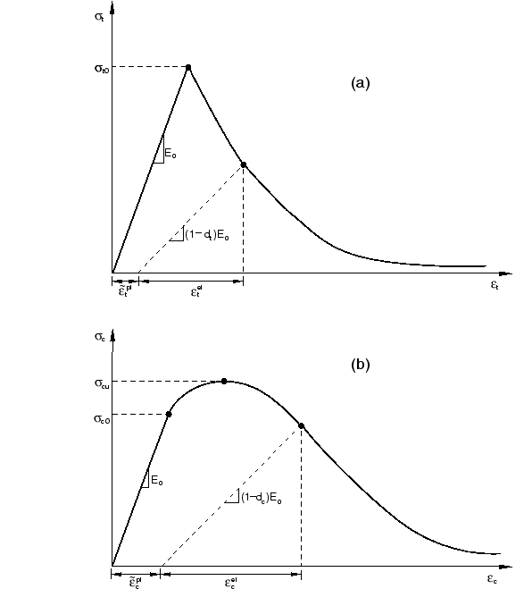 Under uniaxial tension the stress-strain response follows a linear elastic relationship until the value of the failure stress, , is reached. The failure stress corresponds to the onset of micro-cracking in the concrete material. Beyond the failure stress the formation of micro-cracks is represented macroscopically with a softening stress-strain response, which induces strain localization in the concrete structure. Under uniaxial compression the response is linear until the value of initial yield, . In the plastic regime the response is typically characterized by stress hardening followed by strain softening beyond the ultimate stress, . This representation, although somewhat simplified, captures the main features of the response of concrete.