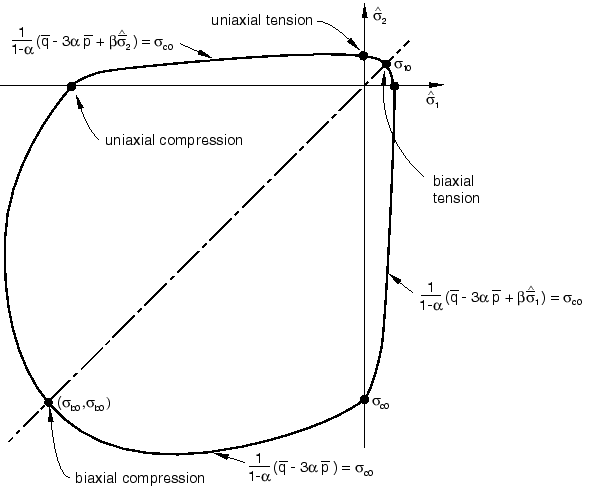 Typical yield surfaces are shown in Figure 23.6.3–8 on the deviatoric plane and in Figure 23.6.3–9 for plane stress conditions.