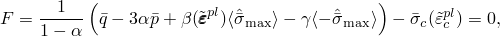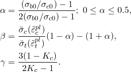 The model makes use of the yield function of Lubliner et. al. (1989), with the modifications proposed by Lee and Fenves (1998) to account for different evolution of strength under tension and compression. The evolution of the yield surface is controlled by the hardening variables, and . In terms of effective stresses, the yield function takes the form