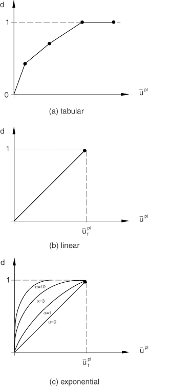 The evolution of the damage variable with the relative plastic displacement can be specified in tabular, linear, or exponential form. Instantaneous failure will occur if the plastic displacement at failure,