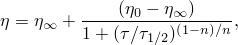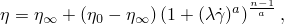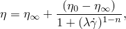 The Carreau-Yasuda model describes the shear thinning behavior of polymers. This model often provides a better fit than the power law model for both high and low shear strain rates. The viscosity is expressed as