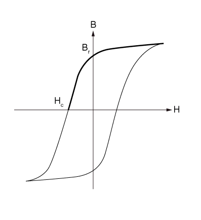 Permanent magnetization in Abaqus is suitable for hard magnetic materials when the magnets are operating around the point of remanence. This behavior captures the response of magnetization or demagnetization around the point of remanence, as shown by the darker descending line of the hysteresis loop in Figure 26.5.3–2. The underlying magnetic permeability can be linear or nonlinear. In either case, permanent magnetization is defined by its coercivity such that