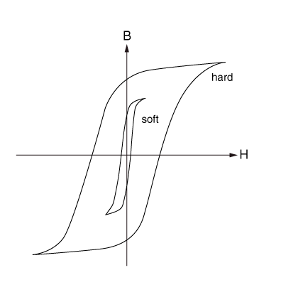 Ferromagnetic materials can be magnetized by placing them in a magnetic field, which is typically created by applying currents in a system of coil windings surrounding the material being magnetized. These materials can be classified into soft and hard magnetic materials (see Figure 26.5.3–1). Soft magnetic materials lose their magnetization after removal of the applied currents (see “Nonlinear magnetic behavior”). Hard magnetic materials retain their magnetization permanently after removal of the applied currents. The leftover magnetization in a permanent magnet is called remanence, denoted by