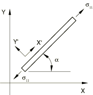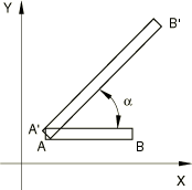 In user subroutine VUMAT all strain measures are calculated with respect to the midincrement configuration. All tensor quantities are defined in the corotational coordinate system that rotates with the material point. To illustrate what this means in terms of stresses, consider the bar shown in Figure 26.7.1–1, which is stretched and rotated from its original configuration,