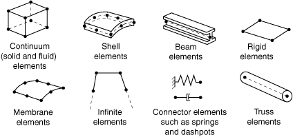 Figure 27.1.1–1 shows the element families that are used most commonly in a stress analysis; in addition, continuum (fluid) elements are used in a fluid analysis. One of the major distinctions between different element families is the geometry type that each family assumes.