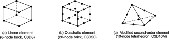 In Abaqus/Standard elements with midside nodes, such as the 20-node brick shown in Figure 27.1.1–2(b), use quadratic interpolation and are often called quadratic elements or second-order elements.