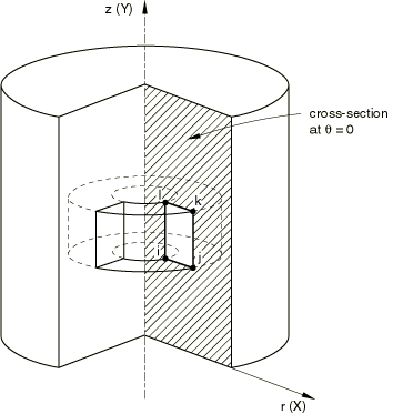 . Figure 27.1.2–2 shows an element of an axisymmetric body. The nodes i, j, k, and l are actually nodal “circles,” and the volume of material associated with the element is that of a body of revolution, as shown in the figure. The value of a prescribed nodal load or reaction force is the total value on the ring; that is, the value integrated around the circumference.