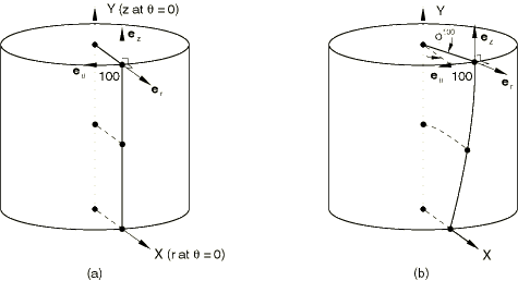(in radians) about the z-axis, each of which is constant in the circumferential direction, so that the deformed geometry remains axisymmetric. Figure 27.1.2–3(b) shows the deformed geometry of the reference model shown in Figure 27.1.2–3(a) and the local cylindrical coordinate system at the displaced location of node 100, for a twist