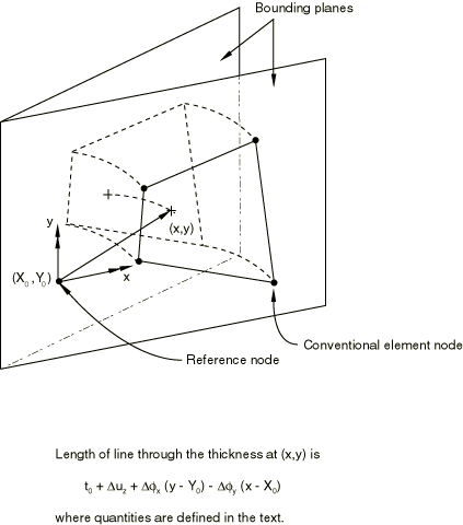 discussed below) remain fixed throughout all steps of an analysis. From the degrees of freedom of the reference node, the length of the axial material fiber passing through the point with current coordinates (x, y) in a bounding plane is defined as