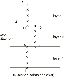 You specify the location of the output variables in the plane of the lamina (layers) when you request output of element variables. For example, you can request values at the centroid of each layer. In addition, you specify the number of output points through the thickness of the layers by providing a list of the “section points.” The default section points for the output are the first and the last section point corresponding to the bottom and the top face, respectively (see Figure 28.1.1–2). See “Element output” in “Output to the data and results files,” Section 4.1.2, and “Element output” in “Output to the output database,” Section 4.1.3, for more information.