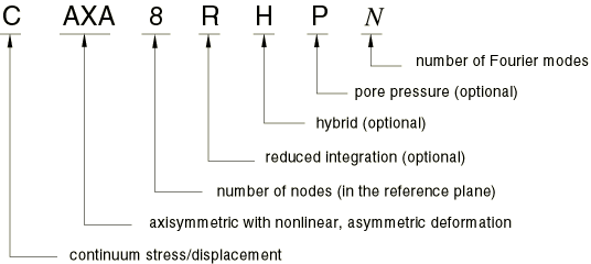 The axisymmetric solid elements with nonlinear asymmetric deformation in Abaqus/Standard are named as shown below. For example, CAXA4RH1 is a 4-node, reduced-integration, hybrid, axisymmetric element with nonlinear asymmetric deformation and one Fourier mode (see “Choosing the element's dimensionality,” Section 27.1.2).