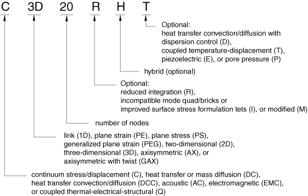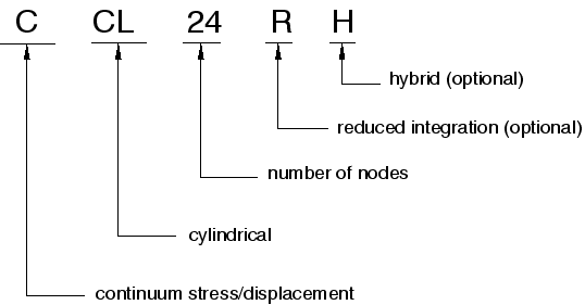 One-dimensional, two-dimensional, three-dimensional, and axisymmetric solid elements in Abaqus are named as shown below. For example, CAX4R is an axisymmetric continuum stress/displacement, 4-node, reduced-integration element; and CPS8RE is an 8-node, reduced-integration, plane stress piezoelectric element. The exception for this naming convention is C3D6 and C3D6T in Abaqus/Explicit, which are 6-node linear triangular prism, reduced integration elements.