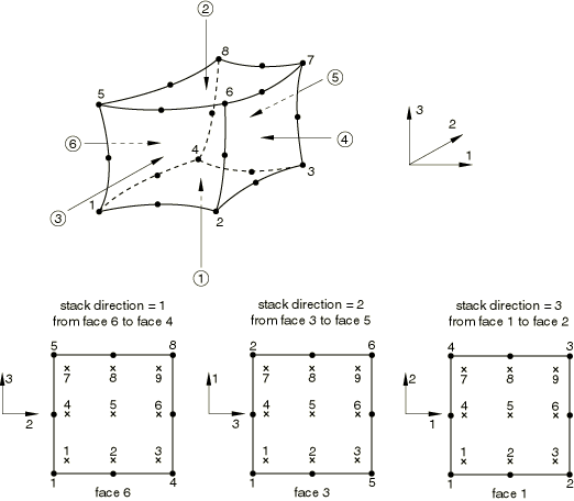 Figure 28.1.1–1 Stacking direction and associated element faces and positions of element integration point output variables in the layer plane.