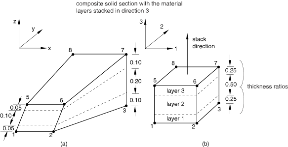The thickness of each layer may not be constant from integration point to integration point within an element since the element dimensions in the stack direction may vary. Therefore, it is defined indirectly by specifying the ratio between the thickness and the element length along the stack direction in the solid section definition, as shown in Figure 28.1.1–3. Using the ratios that are defined for all layers, actual thicknesses will be determined at each integration point such that their sum equals the element length in the stack direction. The thickness ratios for the layers need not reflect actual element or model dimensions.