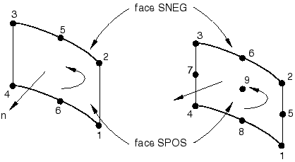 The “top” surface of a membrane is the surface in the positive normal direction (defined below) and is called the SPOS face for contact definition. The “bottom” surface is in the negative direction along the normal and is called the SNEG face for contact definition.