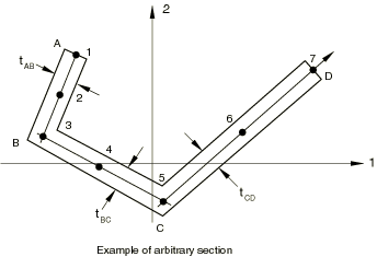 The arbitrary section type is provided to permit modeling of simple, arbitrary, thin-walled, open and closed sections. You specify the section by defining a series of points in the thin-walled cross-section of the beam; these points are then linked by straight line segments, each of which is integrated numerically along the axis of the section so that the section can be used together with nonlinear material behavior. An independent thickness is associated with each of the segments making up the arbitrary section.