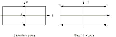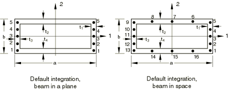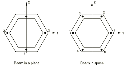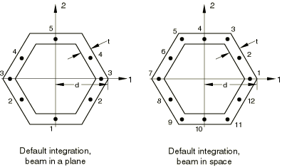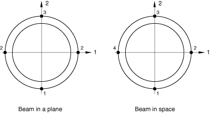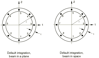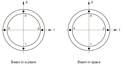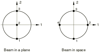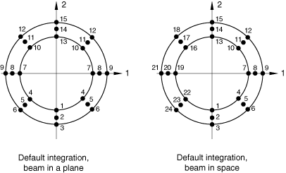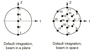 Beam in space: 3 points radially, 8 circumferentially (17 total; trapezoidal rule). Integration point 1 is situated at the center of the beam and is used for output purposes only. It makes no contribution to the stiffness of the element; therefore, the integration point volume (IVOL) associated with this point is zero.