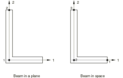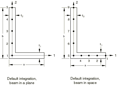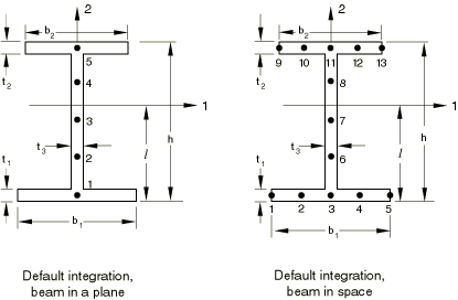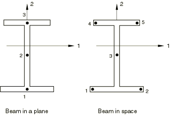 Beam in space: End of flange along positive local 1-axis; section corner; end of flange along positive local 2-axis (points 1, 5, and 9 above for default integration).