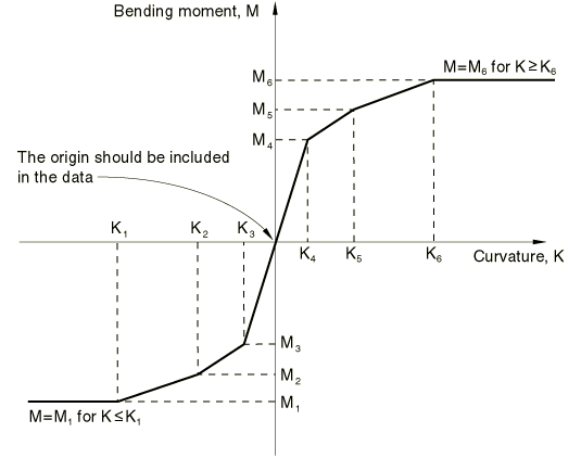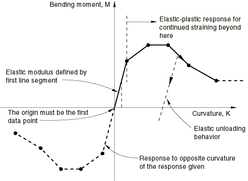The inelastic model is based on assuming linear elasticity and isotropic hardening (or softening) plasticity. The data in this case must begin with the point and proceed to give positive values of the kinematic variable at increasing positive values of the conjugate force or moment. Strain softening is allowed. The elastic modulus is defined by the slope of the initial line segment, so that straining beyond the point that terminates that initial line segment will be partially inelastic. If strain reversal occurs in that part of the response, it will be elastic initially. See Figure 29.3.7–2 for an example.