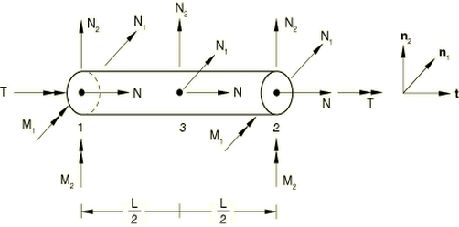 The elastic response of a frame element is governed by Euler-Bernoulli beam theory. The displacement interpolations for the deflections transverse to the frame element's axis (the local 1- and 2-directions in three dimensions; the local 2-direction in two dimensions) are fourth-order polynomials, allowing quadratic variation of the curvature along the element's axis. Thus, each single frame element exactly models the static, elastic solution to force and moment loading at its ends and constant distributed loading along its axis (such as gravity loading). The displacement interpolation along an element's axis is a second-order polynomial, allowing linear variation of the axial strain. In three dimensions the twist rotation interpolation along an element's axis is linear, allowing constant twist strain. The elastic stiffness matrix is integrated numerically and used to calculate 15 nodal forces and moments in three dimensions: an axial force, two shear forces, two bending moments, and a twist moment at each end node, and an axial force and two shear forces at the midpoint node. In two dimensions 8 nodal forces and moments exist: an axial force, a shear force, and a moment at each end, and an axial force and a shear force at the midpoint. The forces and moments are illustrated in Figure 29.4.1–1.