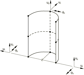 This section provides a reference to the axisymmetric shell elements with nonlinear, asymmetric deformation available in Abaqus/Standard. For an axisymmetric reference geometry where axisymmetric deformation is expected, use regular axisymmetric elements (see “Axisymmetric shell element library,” Section 29.6.9). For an axisymmetric reference geometry where nonaxisymmetric deformation is expected and the thickness to characteristic radius is high or through the thickness detail is required, use CAXA-type elements (see “Axisymmetric solid elements with nonlinear, asymmetric deformation,” Section 28.1.7).