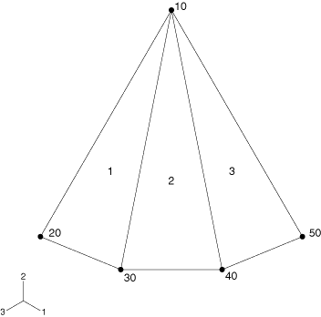 Consider the three element model in Figure 29.6.3–1. Elements 1, 2, and 3 share a common node, node 10, with no user-specified normal defined.