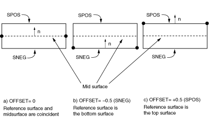 You can define the distance (measured as a fraction of the shell's thickness) from the shell's midsurface to the reference surface containing the element's nodes (see “Defining the initial geometry of conventional shell elements,” Section 29.6.3). Positive values of the offset are in the positive normal direction (see “Shell elements: overview,” Section 29.6.1). When the offset is set equal to 0.5, the top surface of the shell is the reference surface. When the offset is set equal to –0.5, the bottom surface is the reference surface. The default offset is 0, which indicates that the middle surface of the shell is the reference surface.